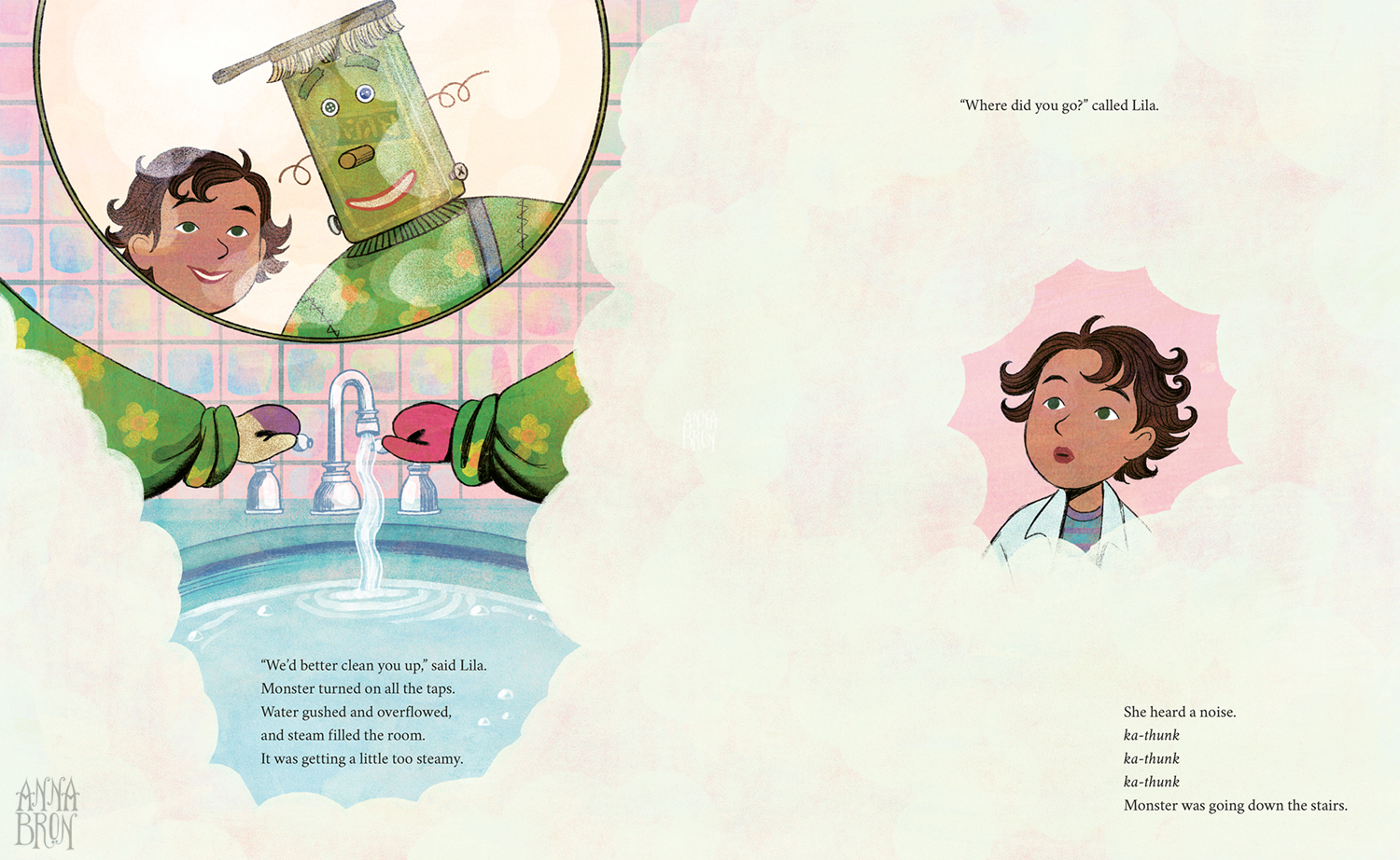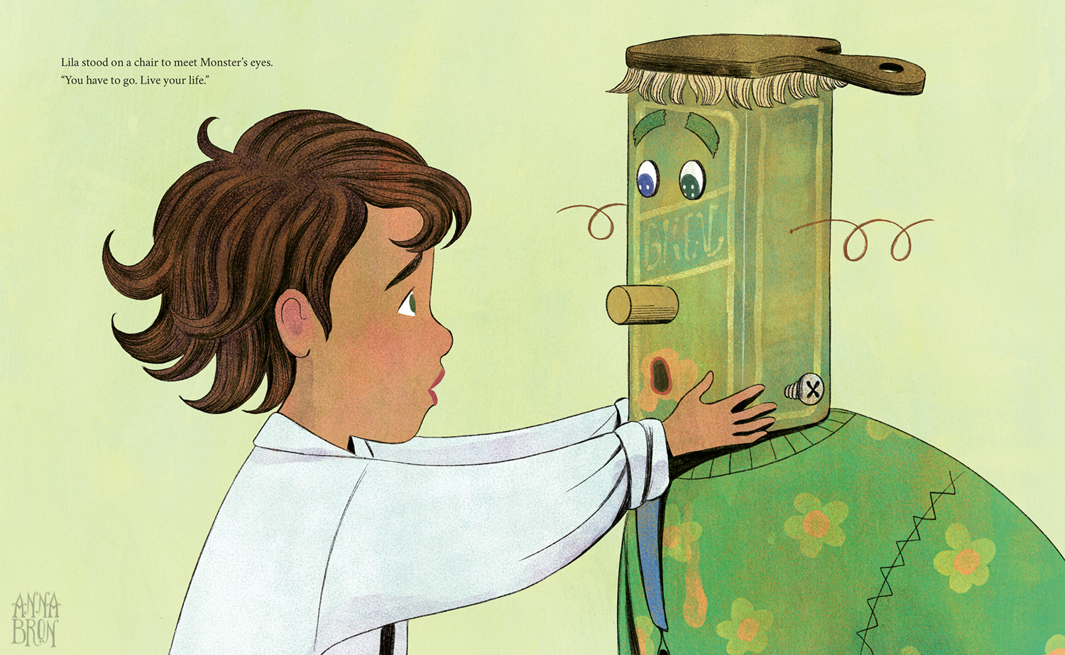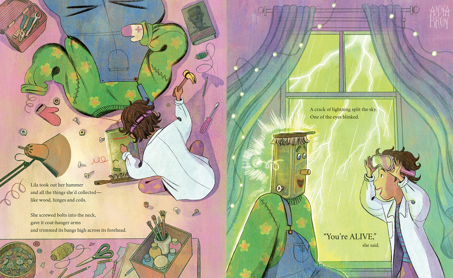 She uses bits and pieces she's collected, like bolts and hinges and coils and—eureka!—with a bolt of lightning, he comes to life. Soon Lila and Monster are bouncing on the bed, making sticky slime and munching on cereal straight from the box.