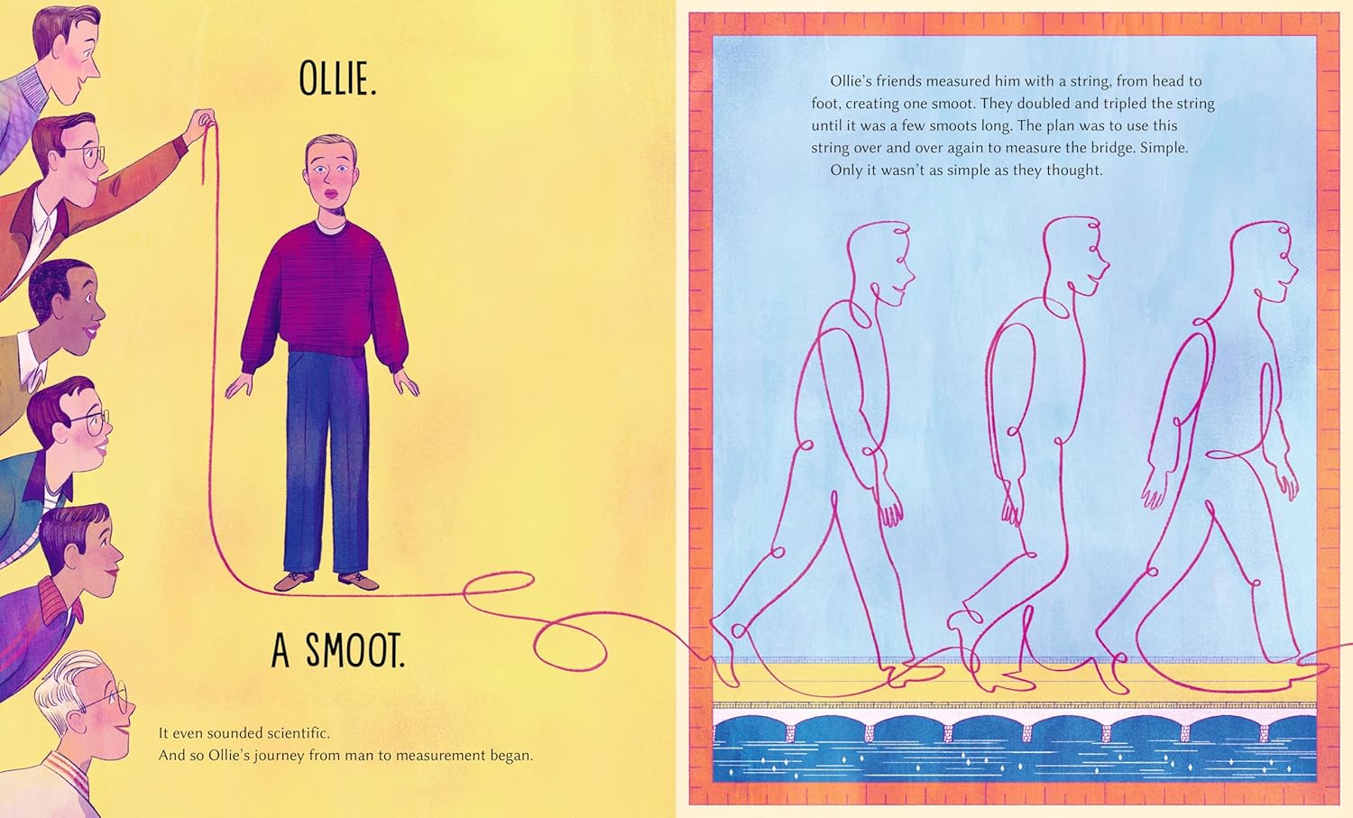 When the five-foot-seven-inch Oliver Smoot and his friends at MIT decided to play a practical joke, he drew the short straw—and was selected to be the measurement device to carry it out. The task? Measuring the length of a bridge, one lying-down Oliver Smoot at a time. Author Jenny Lacika playfully introduces the idea of nonstandard measurement in this story about the creation of a new unit: the smoot. Anna Bron captures the hijinks of college kids having some fun, getting into trouble, and in the end, making math history. Measuring Up invites readers over to the sillier side of mathematics and encourages them to play with measurement in their own lives. As for the smoot? This unorthodox unit of measure is now cemented into history, in sidewalk markings on a certain Cambridge-to-Boston bridge. Find out more about smoots, MIT pranks, unusual measurements, and further reading in the back matter.